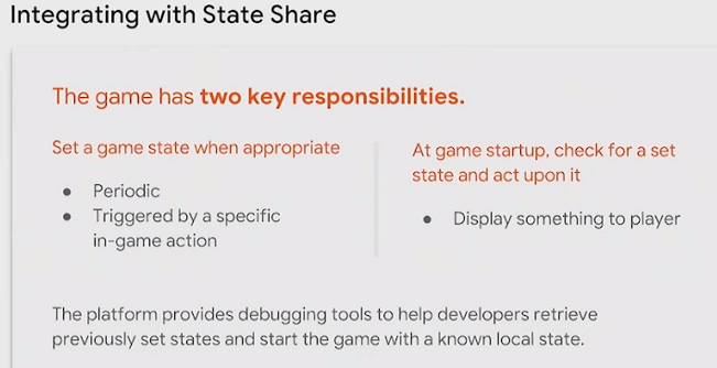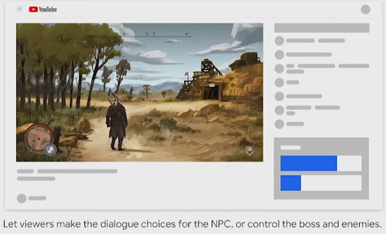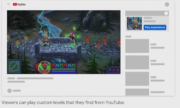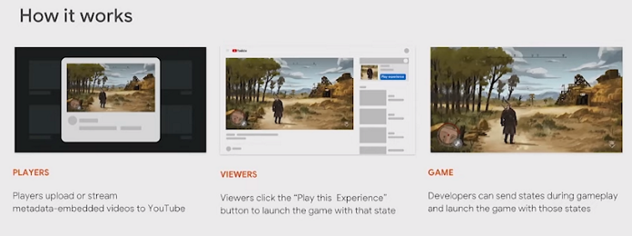 原理:玩家上传带状态元数据的视频到YouTube、或使用Stadia直播游戏;观众找到视频可进入游戏;游戏读取视频元数据,进入指定状态(如关卡)。