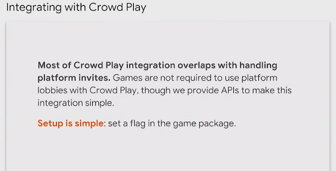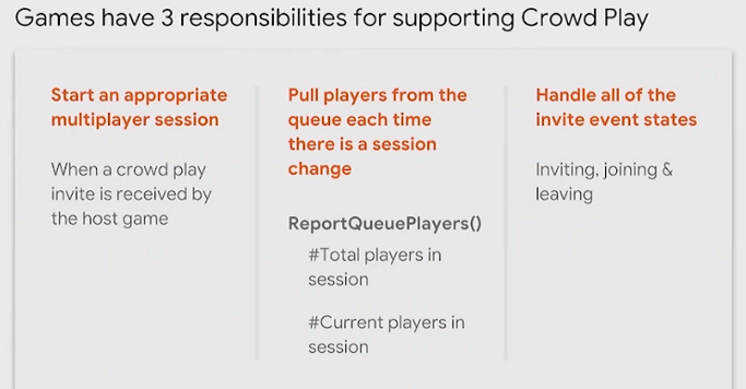 游戏支持Crowd Play,需要先支持Multi Player模式,并使用Stadia SDK从Stadia获取玩家加入、离开的事件