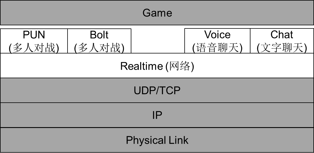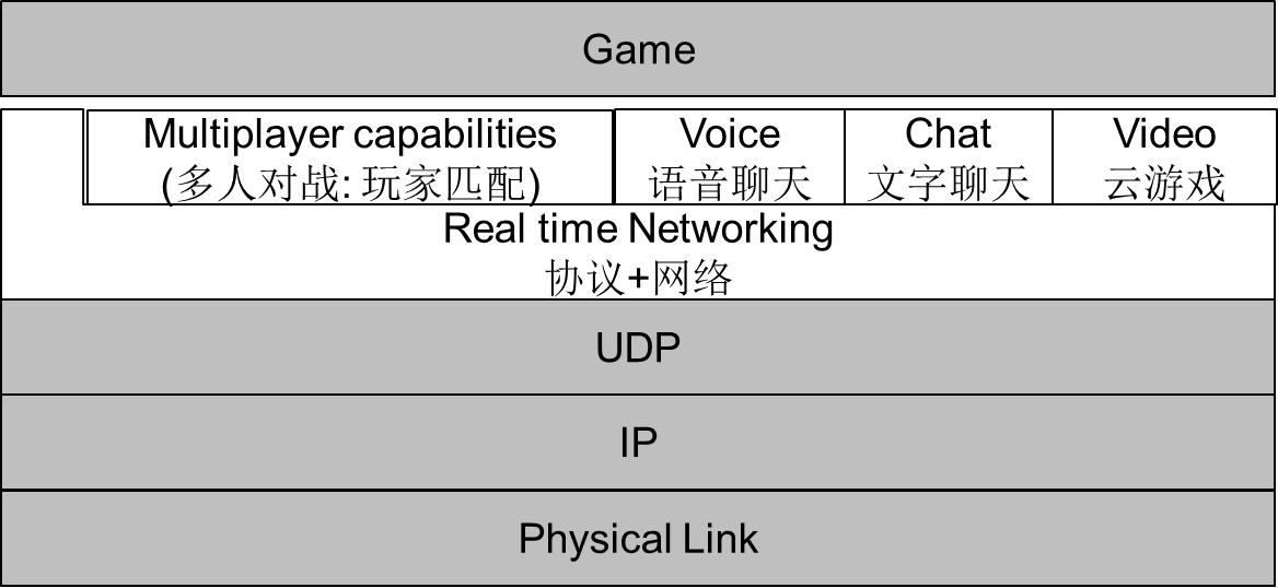 下图是游戏网络引擎技术栈,多人在线游戏通信模式为低时延小包,因此传输层协议一般使用UDP。在UDP之上提供可靠传输等特性,称为实时网络。在此基础上,实现多人对战玩家匹配、语音聊天、文字聊天、视频功能。