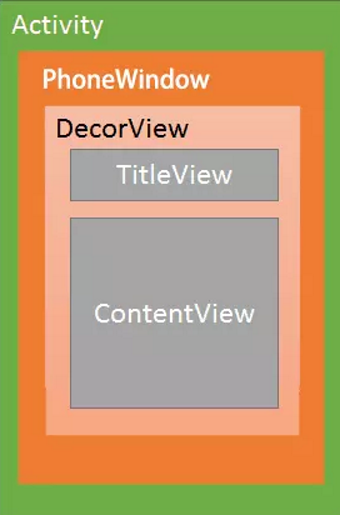 DecorView继承自FrameLayout,DecorView包含两个sub-View:TitleView 与 ContentView 。开发者在Activity的OnCreate方法中调用的SetContentView方法,就是将View设置到 ContentView 。