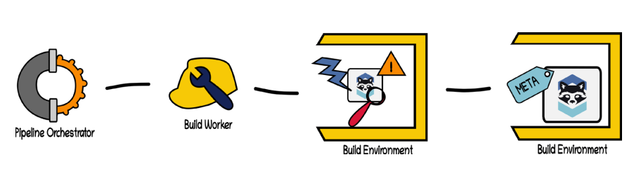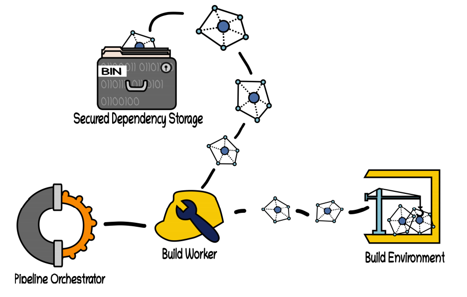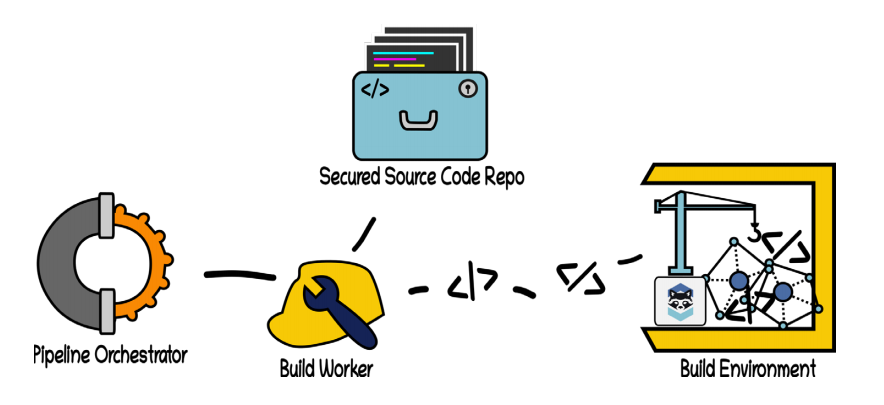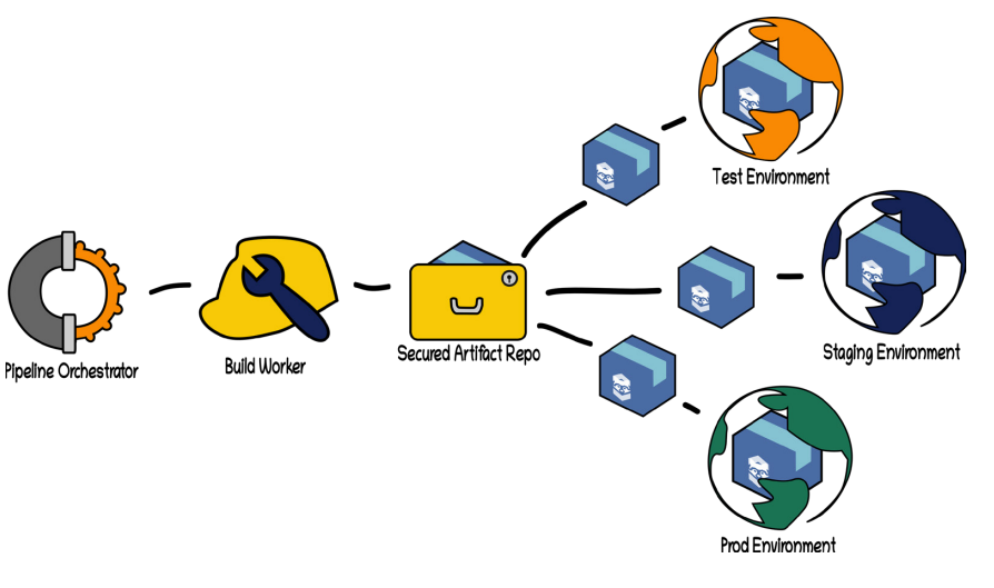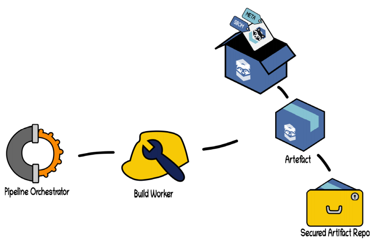 流水线由一些列的安全加固的步骤组成,承载指令的容器镜像存储在安全加固的仓库中,并被安全加固的编排服务调度执行(如K8S)。