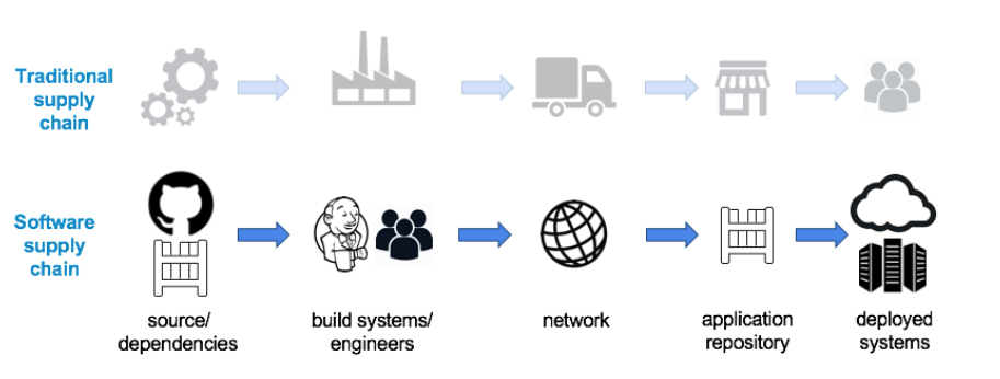 供应链是指产品到消费的流程,在软件领域,软件供应链是指软件开发流程,包含从概念到产品发布(二进制包)与分发。