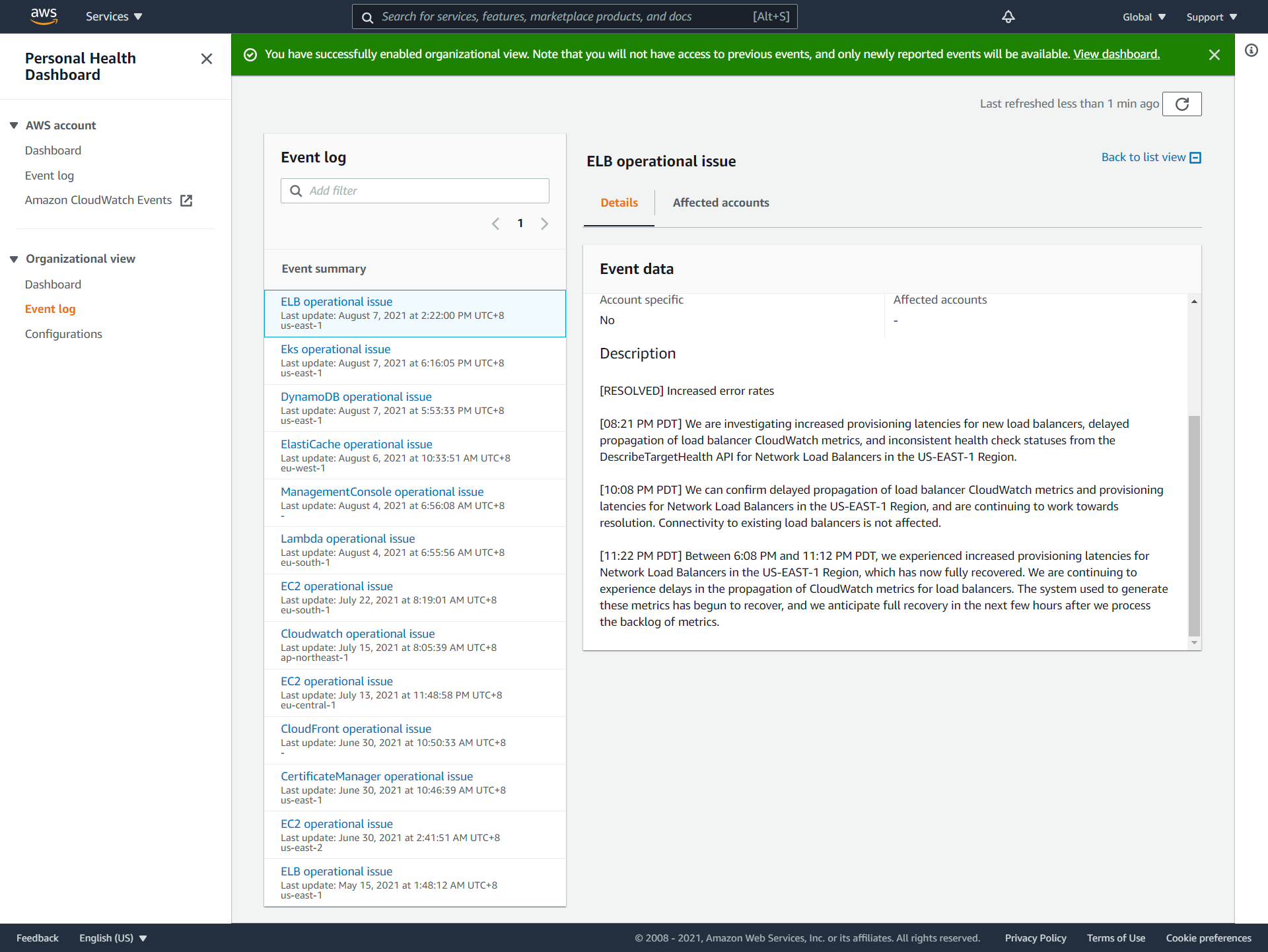 AWS Health 提供租户资源健康看板,包括租户的资源健康状态、以及AWS服务健康状态。AWS Health 与 AWS Organization集成,管理员账号可以在PHD(Personal Health Dashboard)上查看到组织内所有账号下的资源监控状态、以及事件通知。
