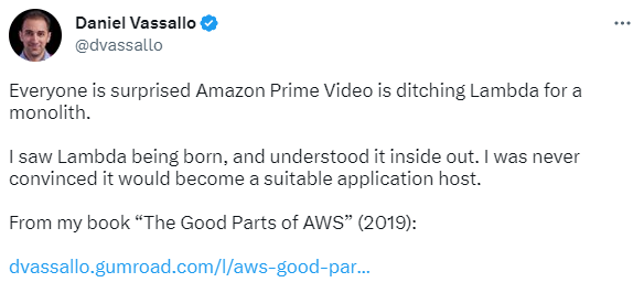 近期一篇AWS Prime Video技术团队发布的文章“AWS-Prime-Video-从微服务转为单体架构成本降低90%”在圈子内引发大家讨论,这篇文章本身有一些标题党的味道,Prime Video所采用的架构本身存在问题,完全是架构师技术选择错误导致的。