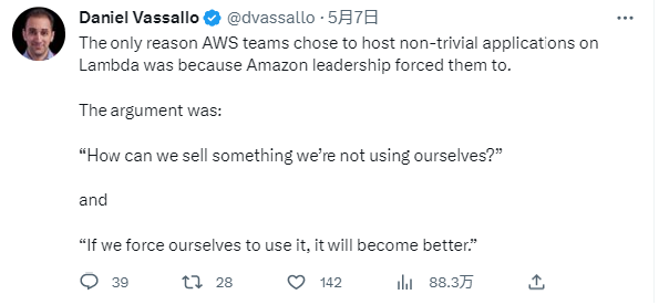 在Twitter上关于这个话题的讨论,有一些观点也是认为Lambda用来host应用程序并不合适: